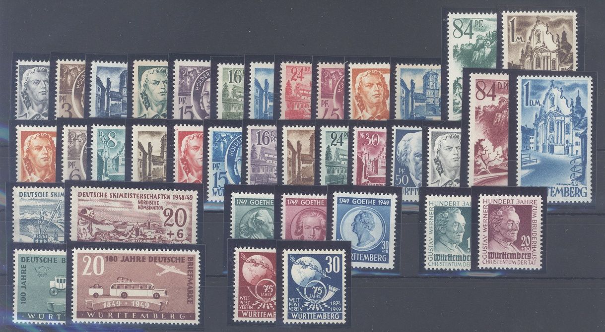 Französische Zone Württemberg, ** Posten auf Steckkarte. Es sind die Michel Nummern 1/27, 38/39 und 44/52 vorhanden.
