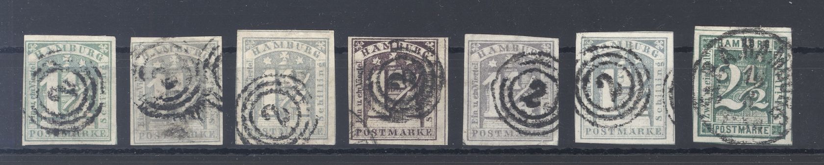 Hamburg Michel Nummer 8/9 Freimarken 1864 weit überkomplett gestempelt mit vielen ganz offensichtlich verschiedenen Farben. Die billigsten Farben werten bereits mit 780,00 Euro...