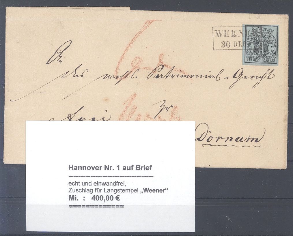 Hannover, sauberer Brief frankiert mit einer sehr schönen Michel Nummer 1, 1 Ggr Freimarke 1850 als EF aus Weenen mit gutem Stempel gelaufen. Nette Ergänzung zur Sammlung!