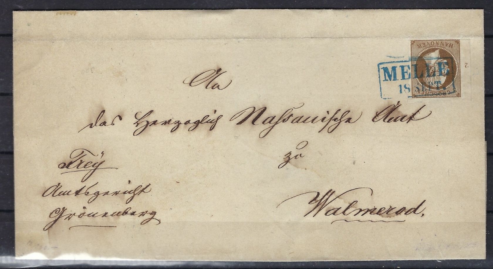 Hannover Mi 19a Randstück mit RZ 2 als EF von Melle n. Walmerod / Wallmerod, Siegel wurde ausgeschnitten