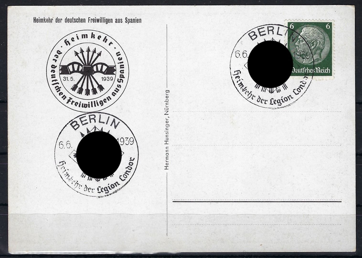 Heimkehr Legion Condor, Bildpostkarte mit SoSt 6.6.1939
