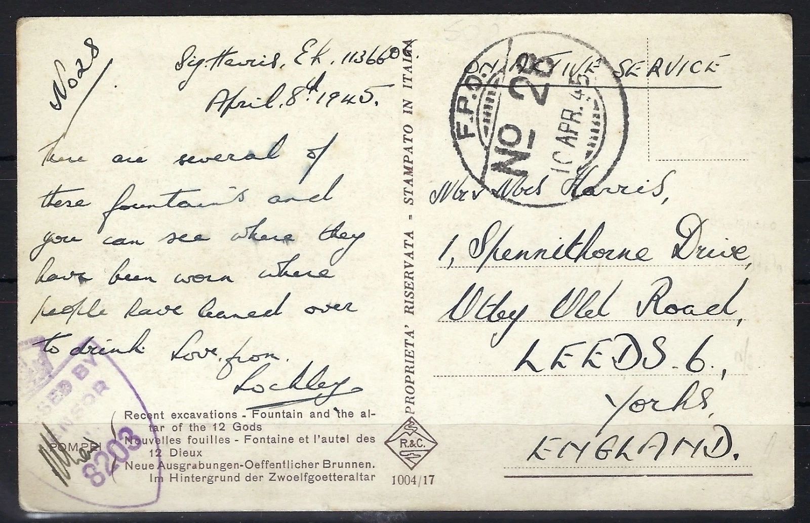 Feldpost eines Angehörigen der indischen Truppen an der Seite der Alliierten, im Einsatz in Italien gegen die Wehrmacht. Feldpostkarte befördert von Savignano nach London, 1945, FPO Nr. 28