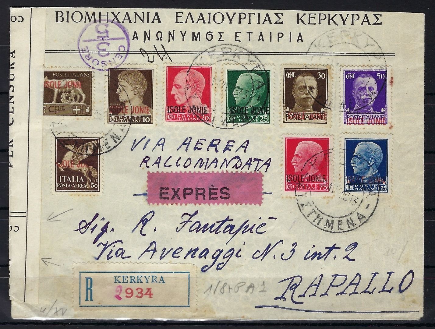 Italien/Jonische Inseln, Mi 15-23 Satzbrief befördert von Korfu n. Rapallo 1943, Satzbrief