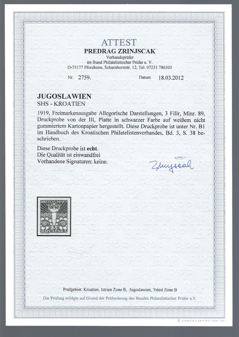 Jugoslawien / SHS-Kroatien 1919, Mi 89 U (*) Probe, FA Zrinjscak