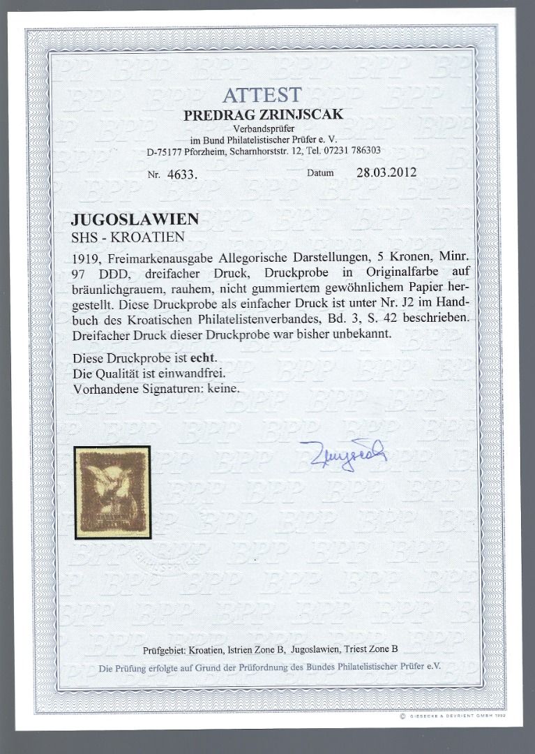 Jugoslawien/SHS-Kroatien 1919, Mi 97 U DDD (*) Probe, FA Zrinjscak