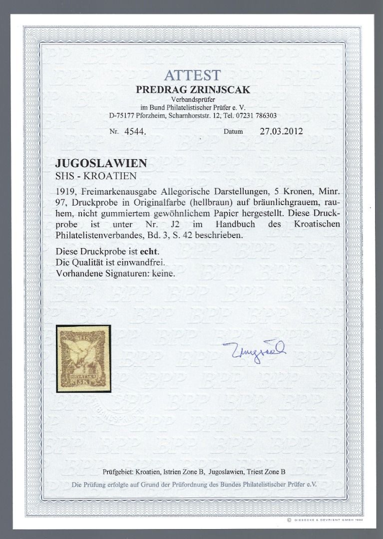 Jugoslawien / SHS-Kroatien 1919, Mi 97 U (*) Probe, FA Zrinjscak
