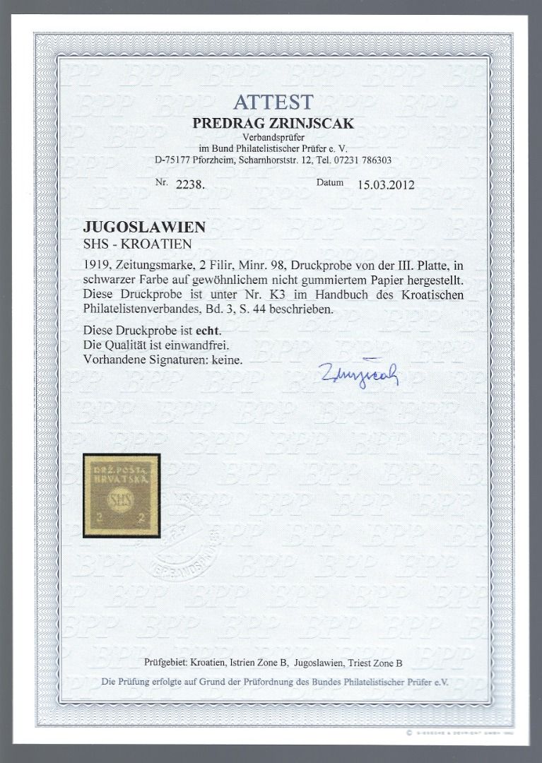 Jugoslawien / SHS-Kroatien 1919, Mi 98 U (*) Probe, FA Zrinjscak