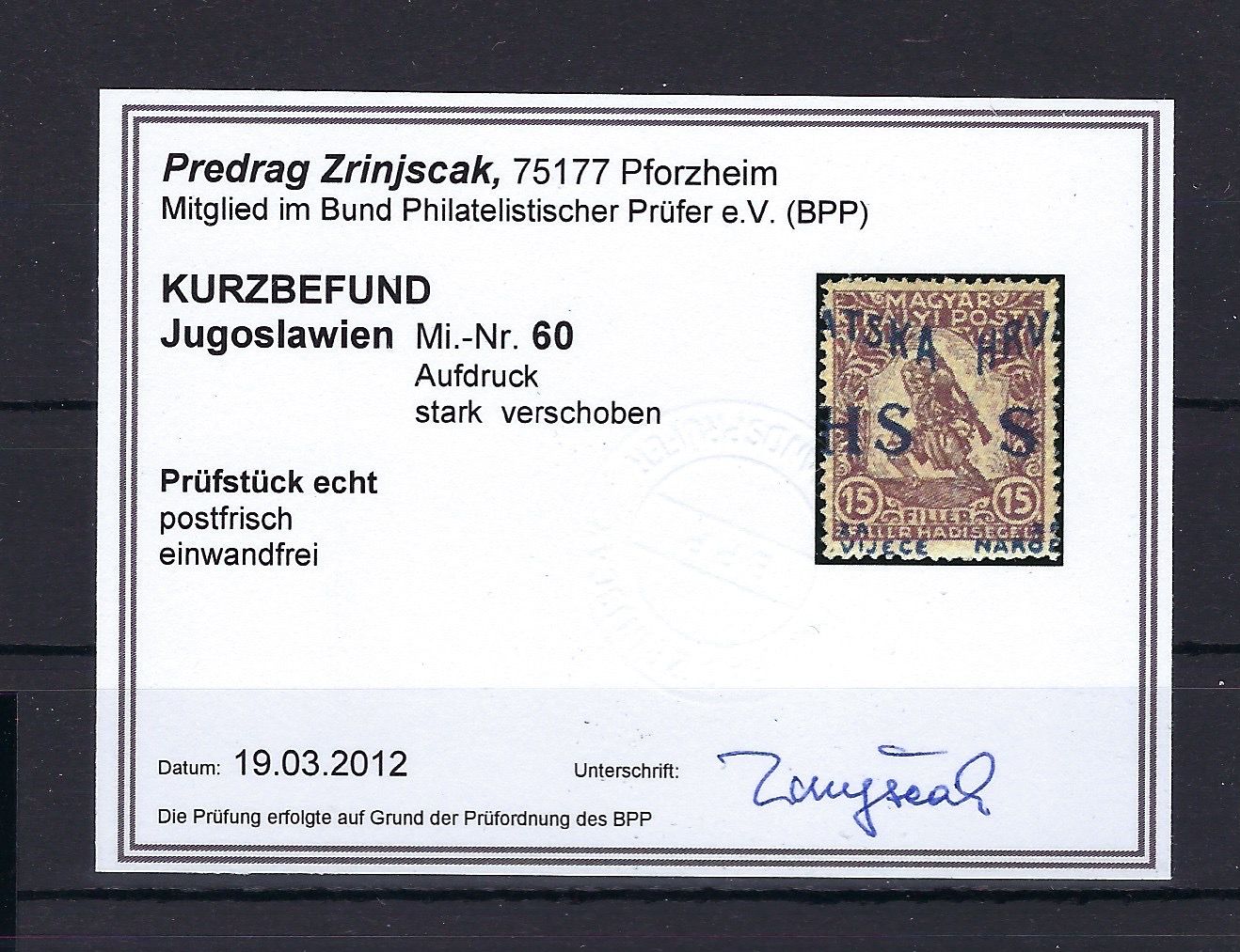 Jugoslawien / SHS-Kroatien, Mi 60 ** Aufdruck verschoben, KB Zrinjscak