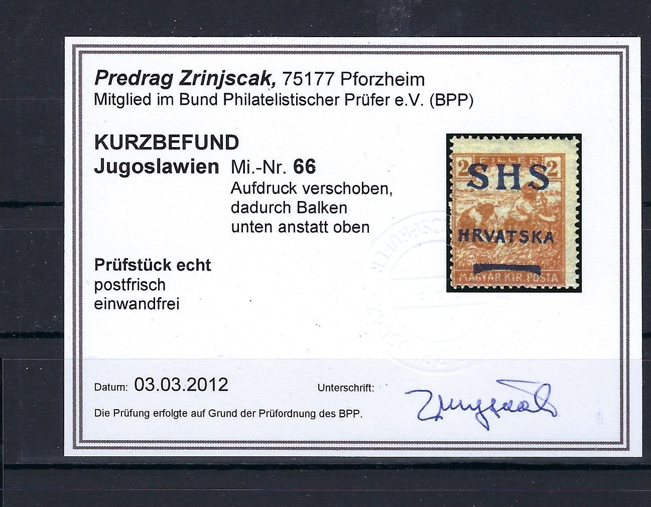 Jugoslawien / SHS-Kroatien, Mi 66 ** Aufdruck verschoben, KB Zrinjscak