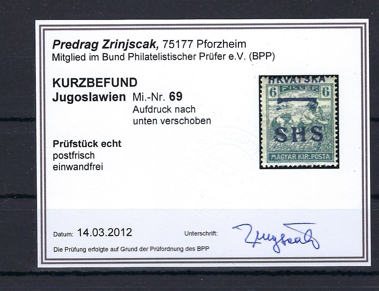 Jugoslawien / SHS-Kroatien, Mi 69 ** Aufdruck verschoben, KB Zrinjscak
