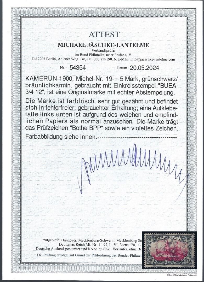 Kamerun Mi 19 ° Buea 3..4.1912, in einwandfreier Qualität, mit FFA J.-Lantelme BPP