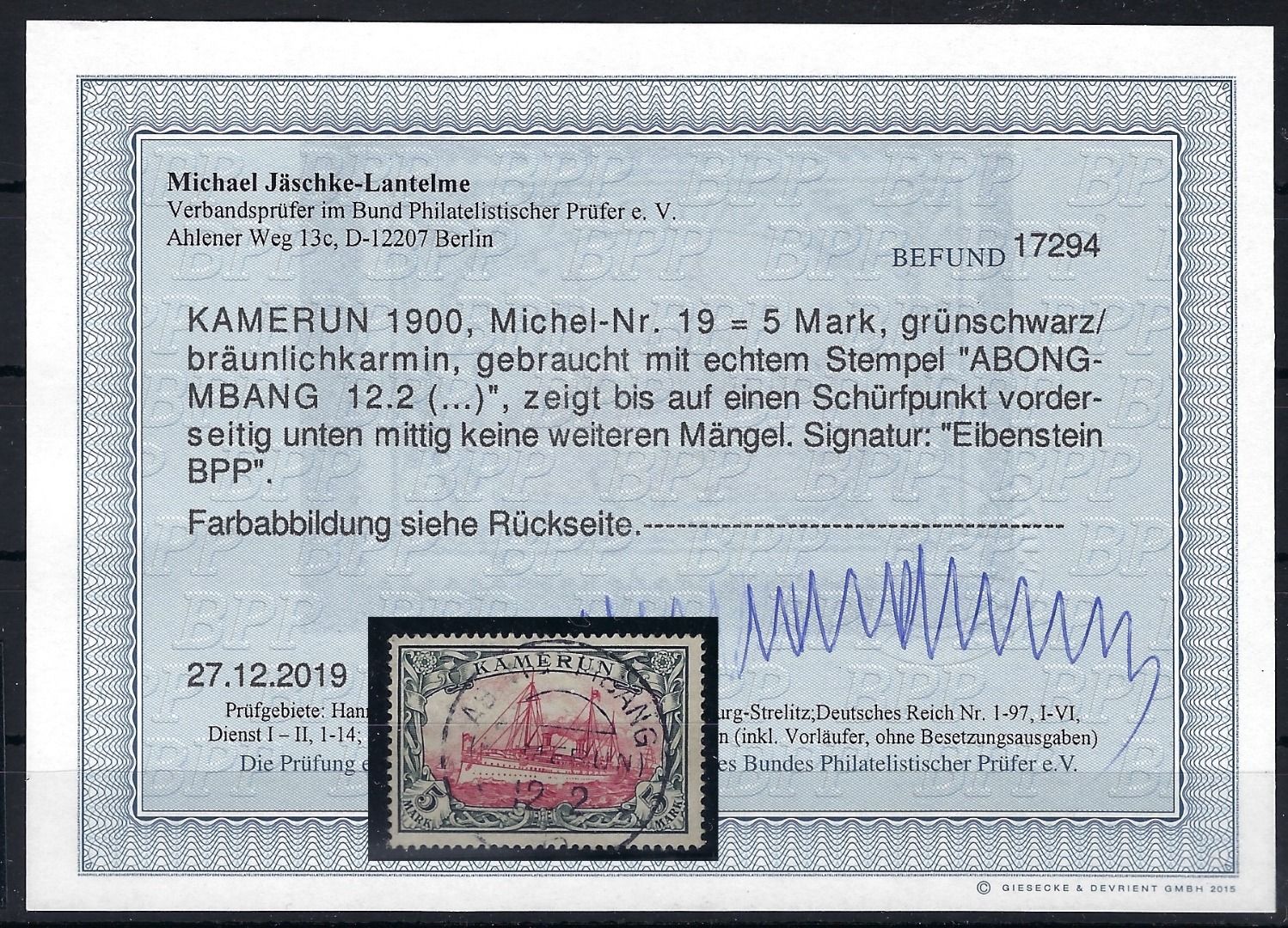 Kamerun Mi 19 ° gest. Abongmbang, kleine Beanstandung, kleiner Schürfpunkt unten Mitte, sonst einwandfrei, mit Befund Jäschke-L BPP