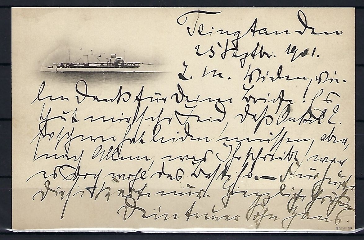 Kiautschou-Mitläufer, Kiautschou-Petschili 5 Pfennig auf Postkarte mit chinesischer Inschrift, mit klarem K1 Tsingtau–Kiautschou 25.9.01, befördert nach Berlin