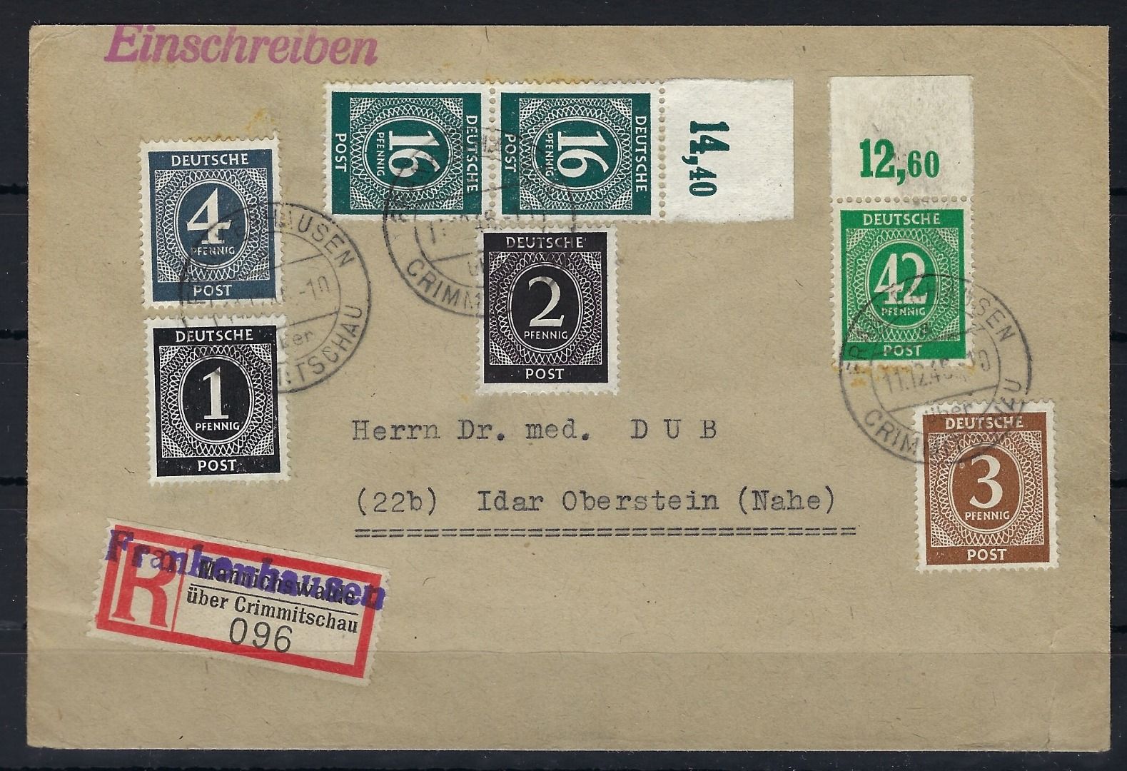 Kontrollrat I Mi 930 P OR als MiF auf Einschreiben portogerecht, befördert von Frankenhausen nach Idar Oberstein, gute Qualität