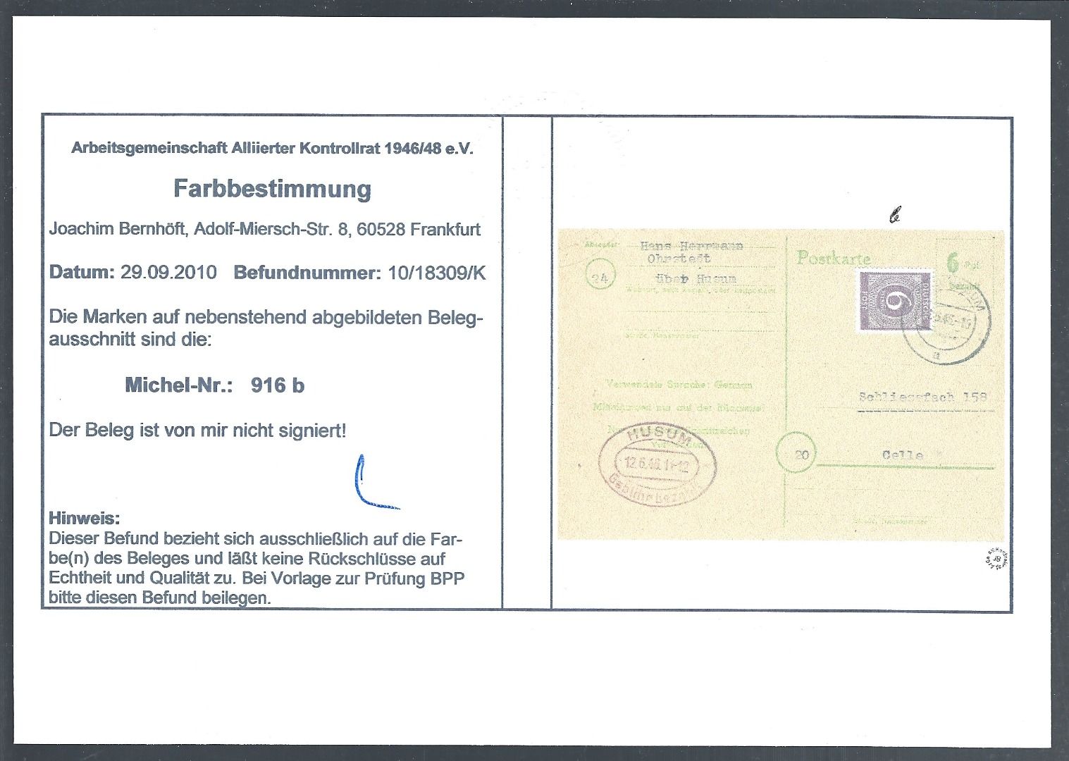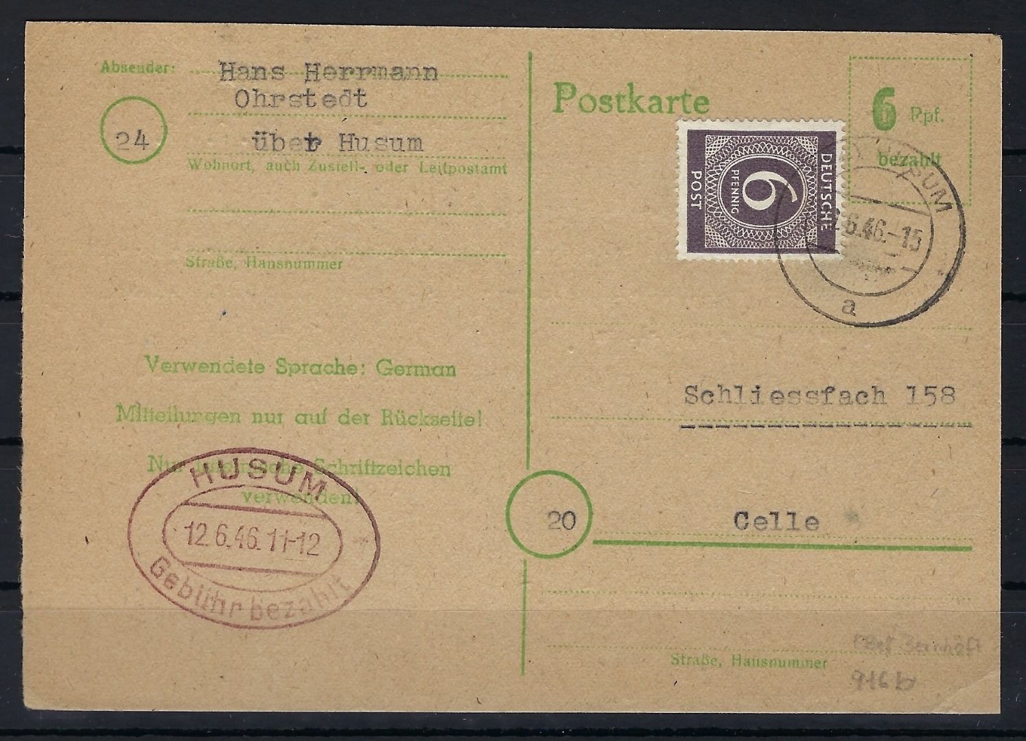 Kontrollrat I Postkarte Gebühr bezahlt mit Zusatzfrank. Mi 916 b , portogerecht über 12 Pfennig im Fernverkehr, mit Farbbestimmung Bernhöft ArGe Kontrollrat