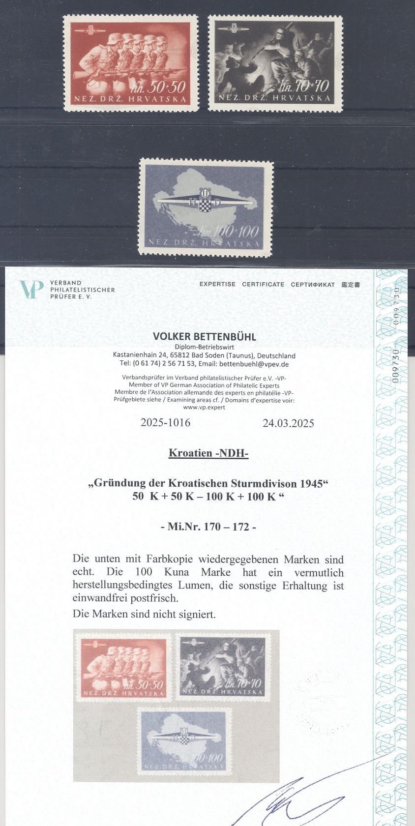 Kroatien Michel Nummer 170/172, Sturmdivision 19345 **, die 100 Kuna hat ein vermutlich herstellungsbedingten Papiereinschluss, sonst ein sehr schöner Satz. Es liegt ein Befund VP vor, ist mit eingescannt.