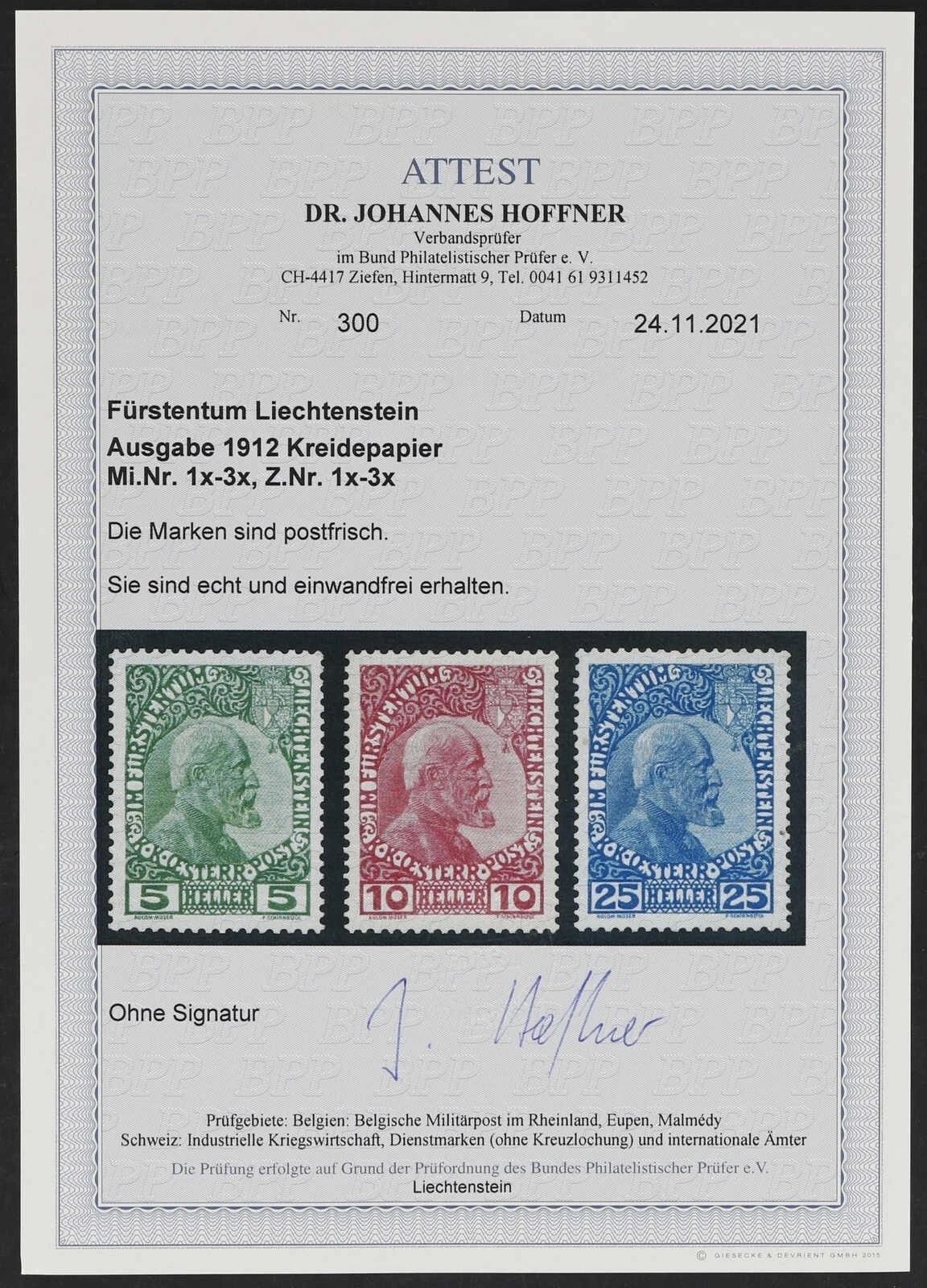 Liechtenstein Mi 1-3 x ** Luxus Satz, FA Hoffner BPP