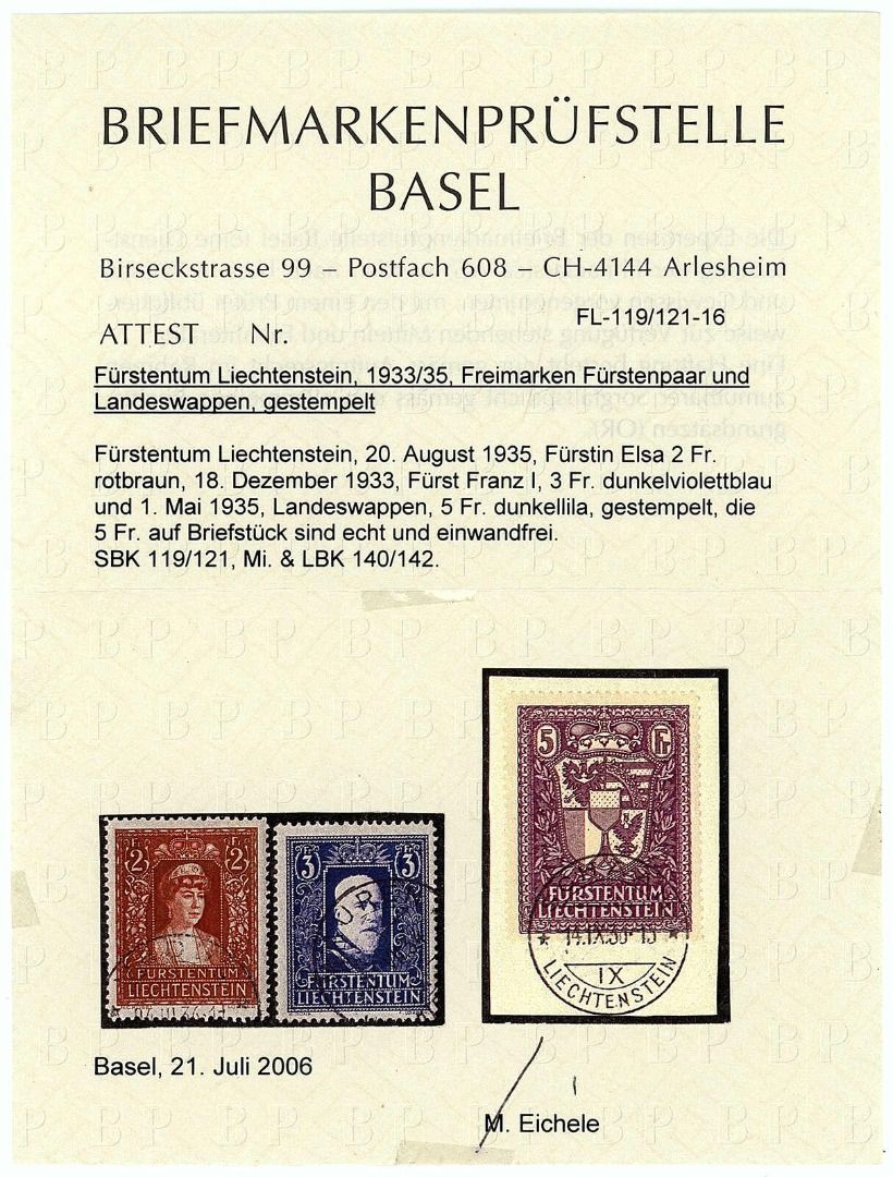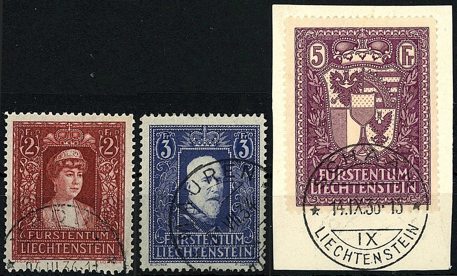Fürstin Elsa, Fürst Franz I. und Landeswappen 1933, kompletter Satz in gestempelter Erhaltung, alle sauber entwertet. Fotoattest Basel, echt und einwandfrei. ME. 1.700,-€