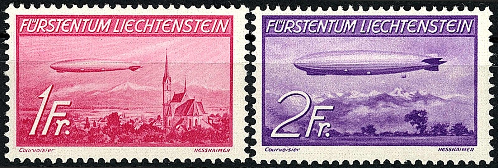 1 Fr. - 2 Fr. Zeppeline 1936, kompletter Satz in postfrischer Luxuserhaltung, unsigniert. ME. 220,-€