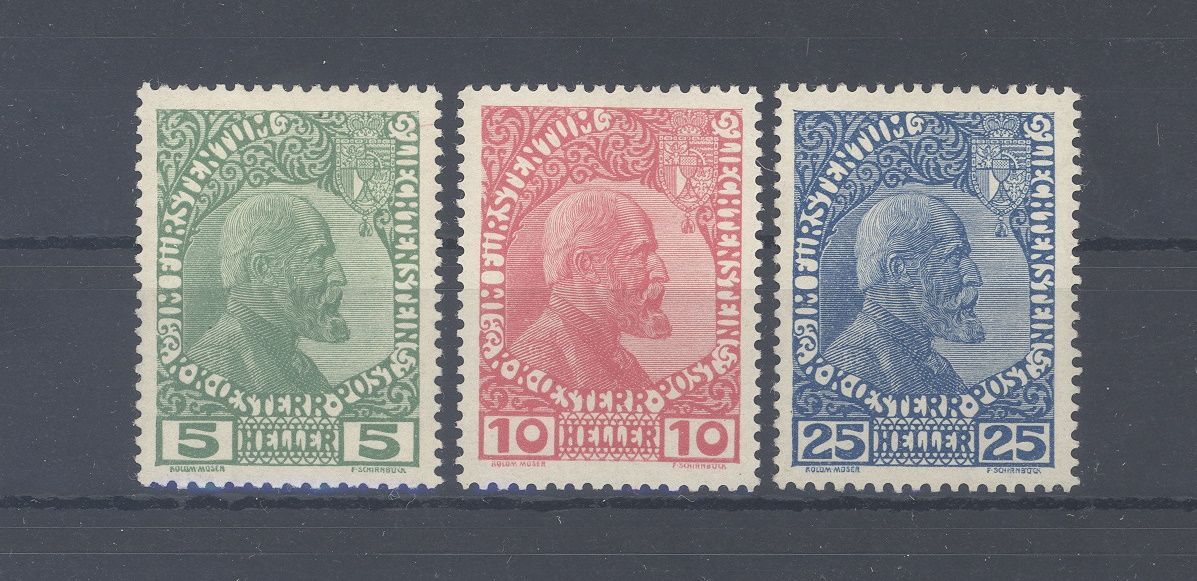 Liechtenstein Michel Nummer 1/3y, Freimarken 1915 ungebraucht * in guter Erhaltung. Es liegt ein Befund vor.
