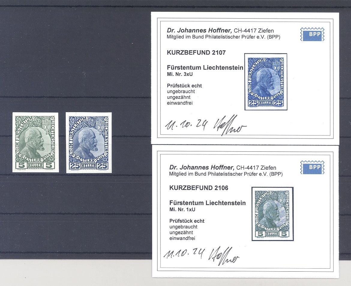 Liechtenstein Michel Nummer 1x U und 3x U, die 5 Heller und 25 Heller aus Freimarken 1912 ungezähnt ungebraucht * in sehr guter Erhaltung. Es liegen zwei Kurzbefunde BPP vor, haben bereits einiges gekostet, sind mit eingescannt, selten einmal angeboten.