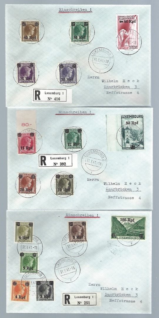 Luxemburg, Mi 17-32 auf 3 Einschreibebriefe, Luxemburg-Saarbrücken