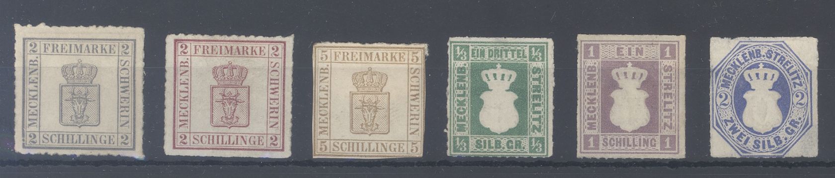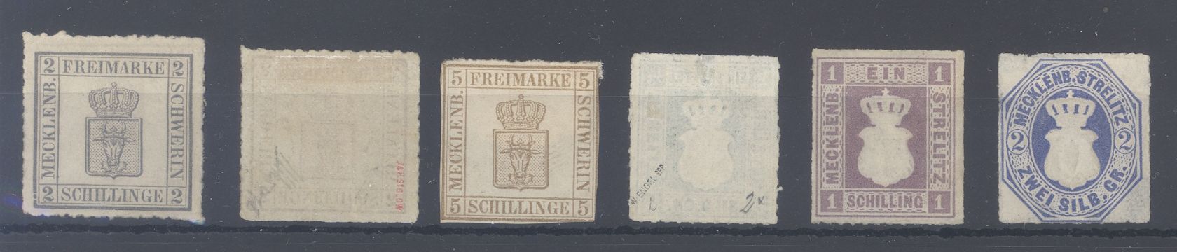 Mecklenburg, 5 verschiedene ungebrauchte Werte in wie üblich etwas unterschiedlicher Erhaltung als Posten, es sind die Michel Nummer Schwerin 6a/b, 8 und Strelitz 2/3, 5 vorhanden. Der Michel für ungebraucht (*) beträgt bereits 630,00 Euro, zwei Werte sind geprüft.