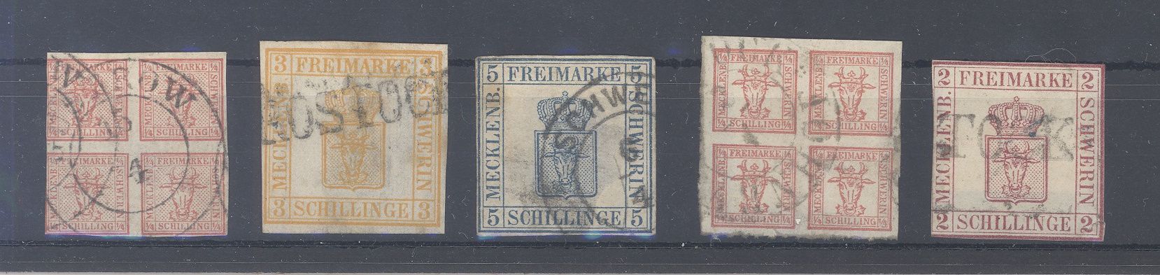 Mecklenburg Schwerin Michel Nummer 1/3 und 5/6 aus Freimarken 1856/64 gestempelt in doch ziemlich unterschiedlicher Erhaltung. Billigst!