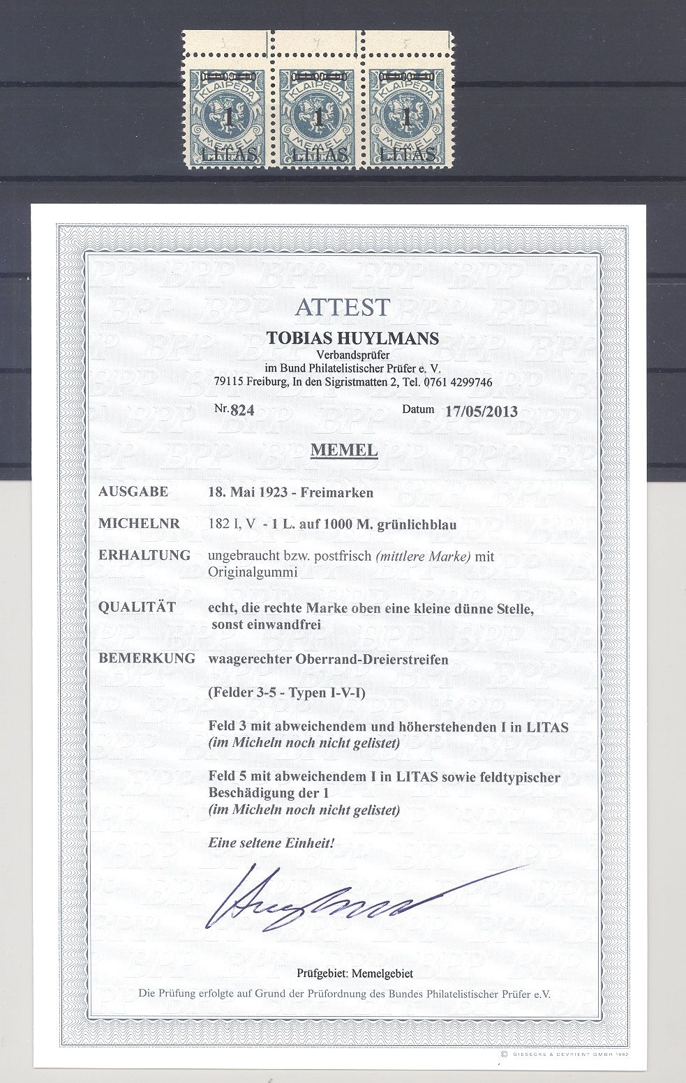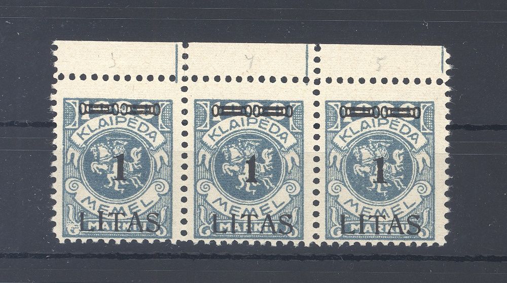 Memel Michel Nummer 182, 1 L. Freimarke 1923 als */** Dreierstreifen mit einer kleinen Einschränkung, sonst ordentlich sogar vom Oberrand mit zwei guten Plattenfehlern. Es liegt ein FA BBP vor, hat bereits einiges gekostet, ist mit eingescannt. Wie im FA auch angegeben eine seltene Einheit!