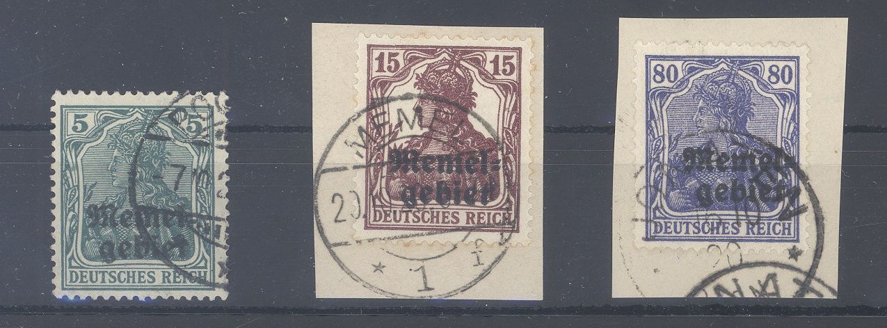 Memel Michel Nummer 1c, 3xb und 17a aus Freimarken 1920 gestempelt. Jeder Wert ist geprüft BPP.