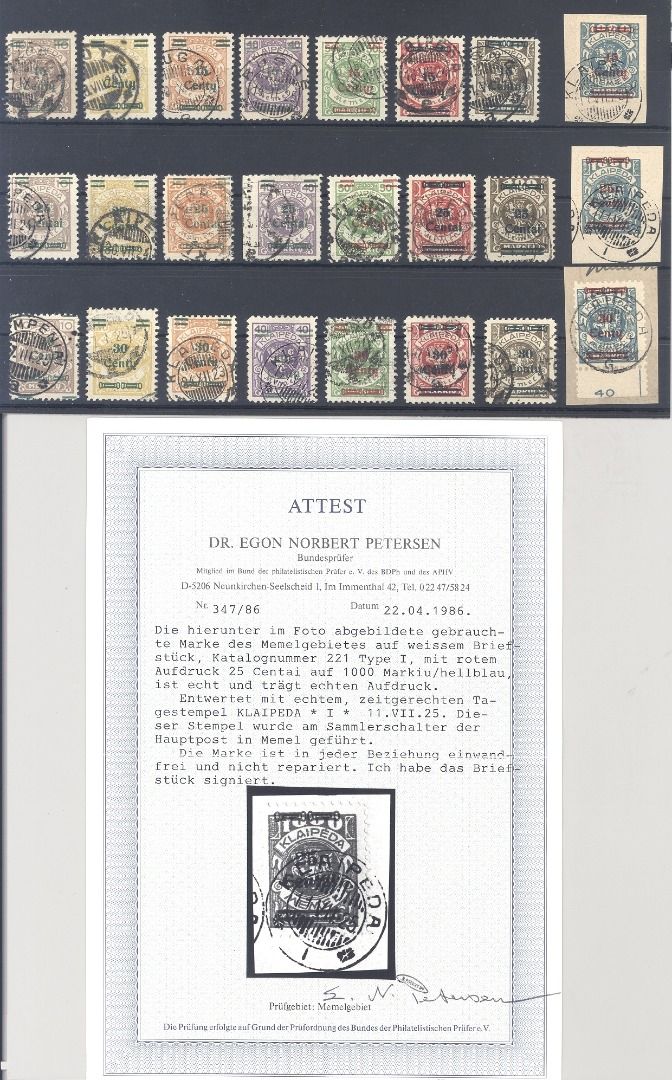 Memel Litauische Besetzung Michel Nummer 206/29 aus Litauische Besetzung 1923 gestempelt. Jeder Wert ist geprüft BPP und für die wichtige Michel Nummer 221 liegt sogar ein FA BPP vor, ist mit eingescannt. Selten einmal angeboten!