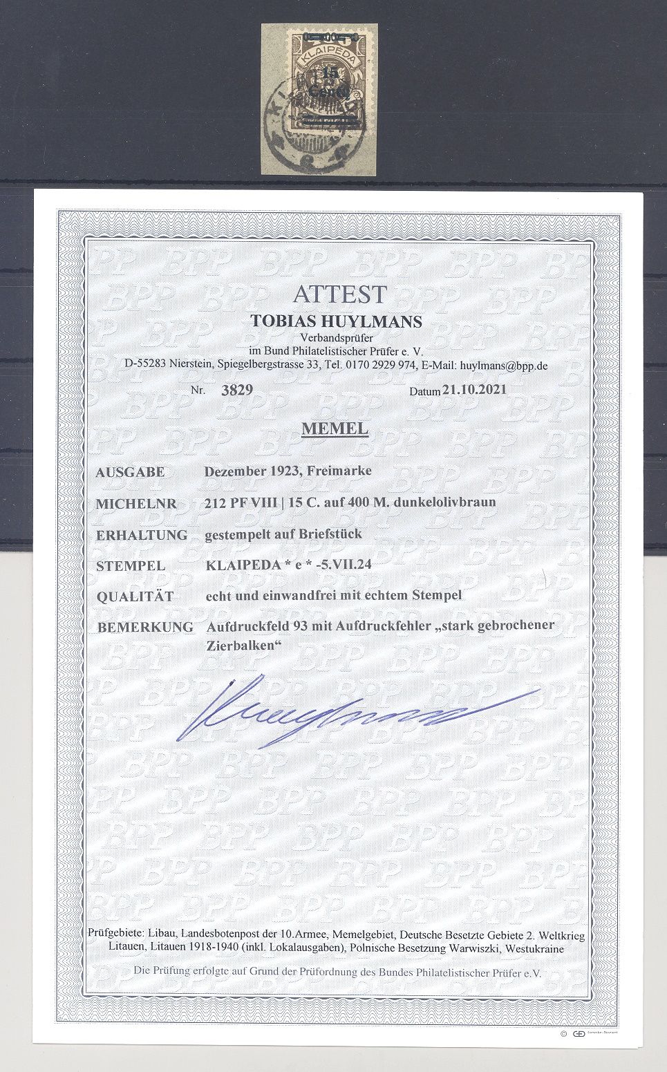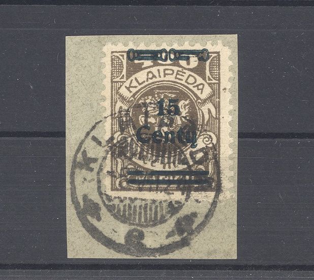 Memel Litauische Besetzung Michel Nummer 212 PF VIII, die 25 C. Freimarke 19323 mit dem Plattenfehler VIII gestempelt auf Briefstück, ein sehr ordentlicher Wert. Es liegt ein FA BPP vor, ist mit eingescannt, hat bereits einiges gekostet, nette Ergänzung zur Sammlung!