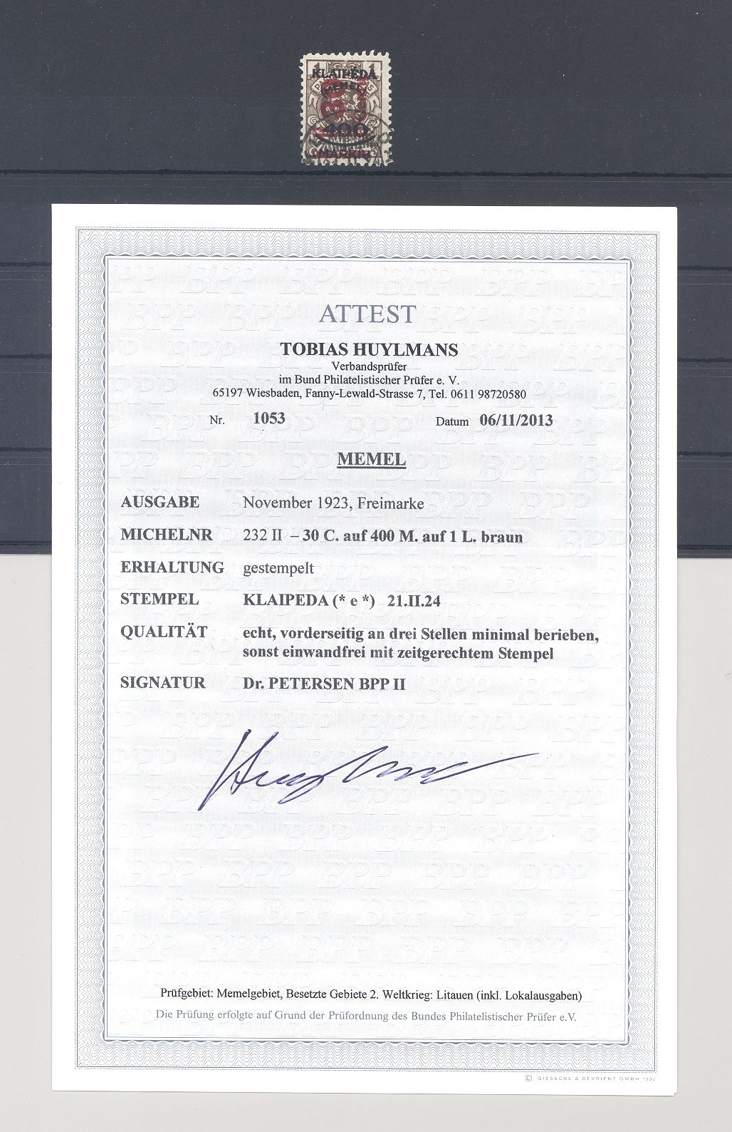 Memel Michel Nummer 232 II, die 30 C. aus Lit. Bes. 1923 in der guten Type III gestempelt mit leichten Einschränkungen, sonst und auch insgesamt in ordentlicher Bedarfserhaltung. Es liegt ein FA Huylmans BBP vor, hat bereits einiges gekostet, ist mit eingescannt.