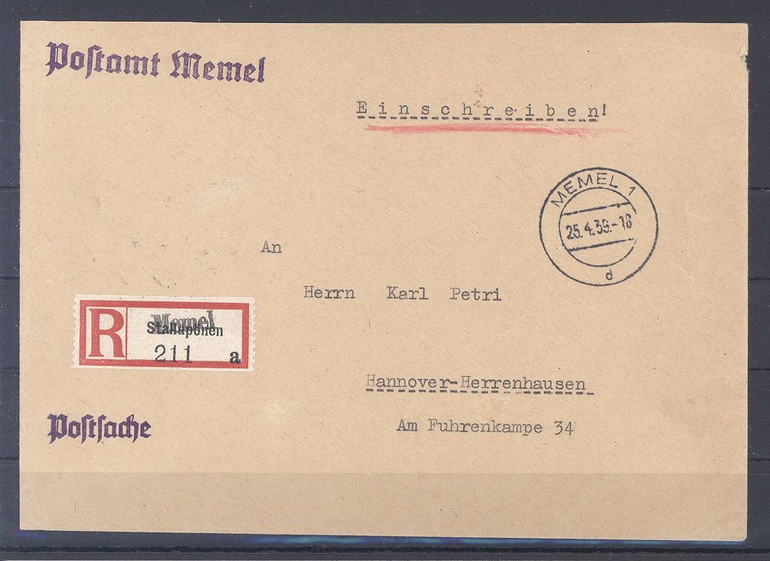 Memel, sauberer Einschreib - Brief vom 25.41939 mit Überdruck R - Zettel aus Stallupönen nach Hannover mit rückseitigem Ankunftsstempel gelaufen. Nette Ergänzung zur Sammlung!