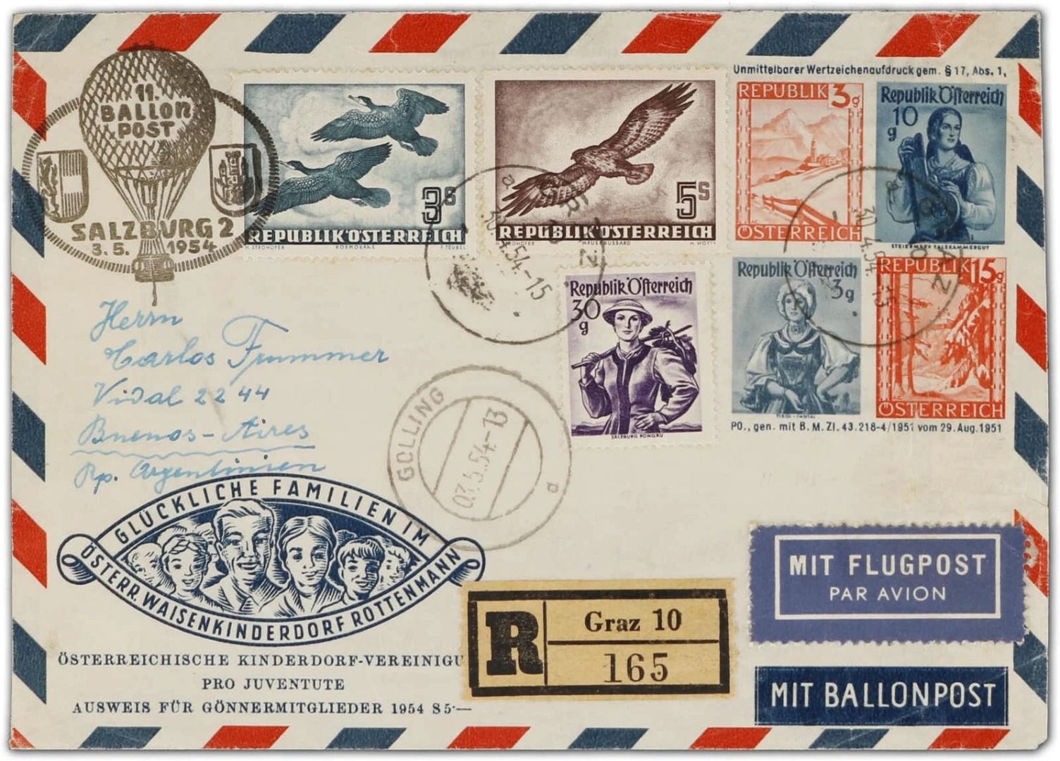 Österreich Kinderdorf-GA, Ballonpost n. Buenos Aires 1954, seltene Destination
