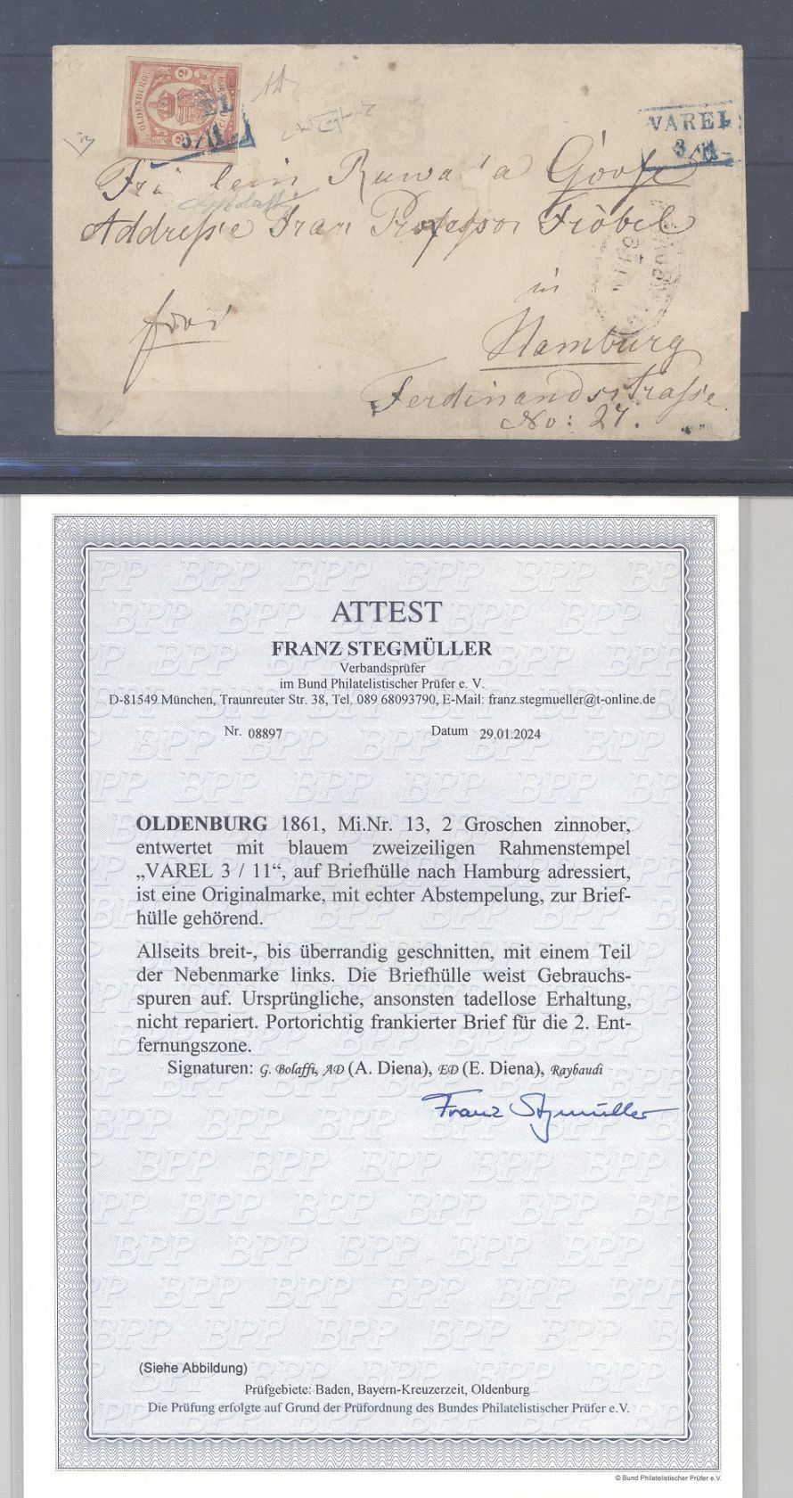 Oldenburg, sauberer Brief frankiert mit einer sehr schönen Michel Nummer 13, 2 Groschen als EF aus Varel gelaufen. Es liegt ein FA BBP vor, hat bereits einiges gekostet, ist mit eingescannt, echte Rarität!