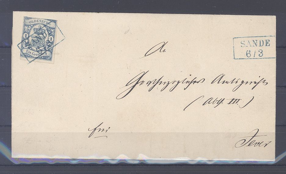 Oldenburg, sauberer Brief frankiert mit Michel Nummer 12, 1 Groschen 1861 als EF aus Sande nach Jever mit rückseitigem Ankunftsstempel gelaufen.