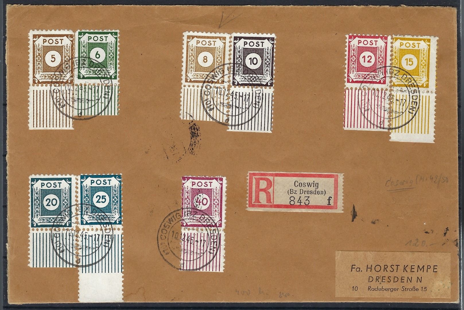 Ost Sachsen / Coswig, Mi 42 - 50 D I Satzbrief, jede Marke gep. Kunz BPP, dreiseitig geöffnet