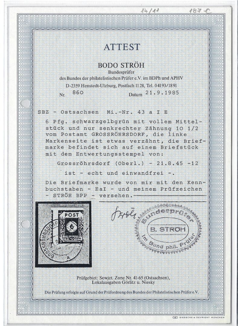 Ost Sachsen Mi 43 a I E ° auf Briefstück, mit FFA Stroh BPP