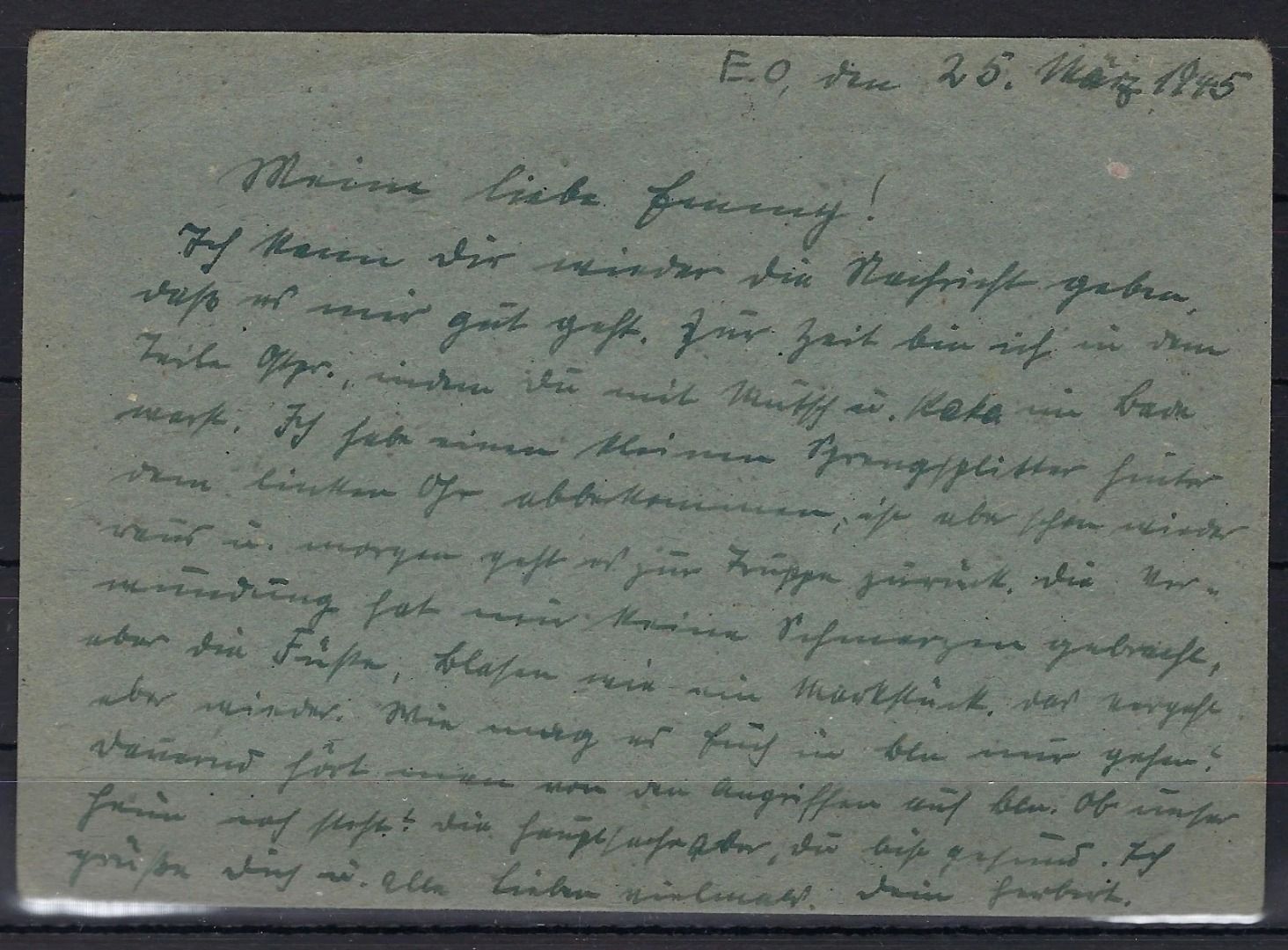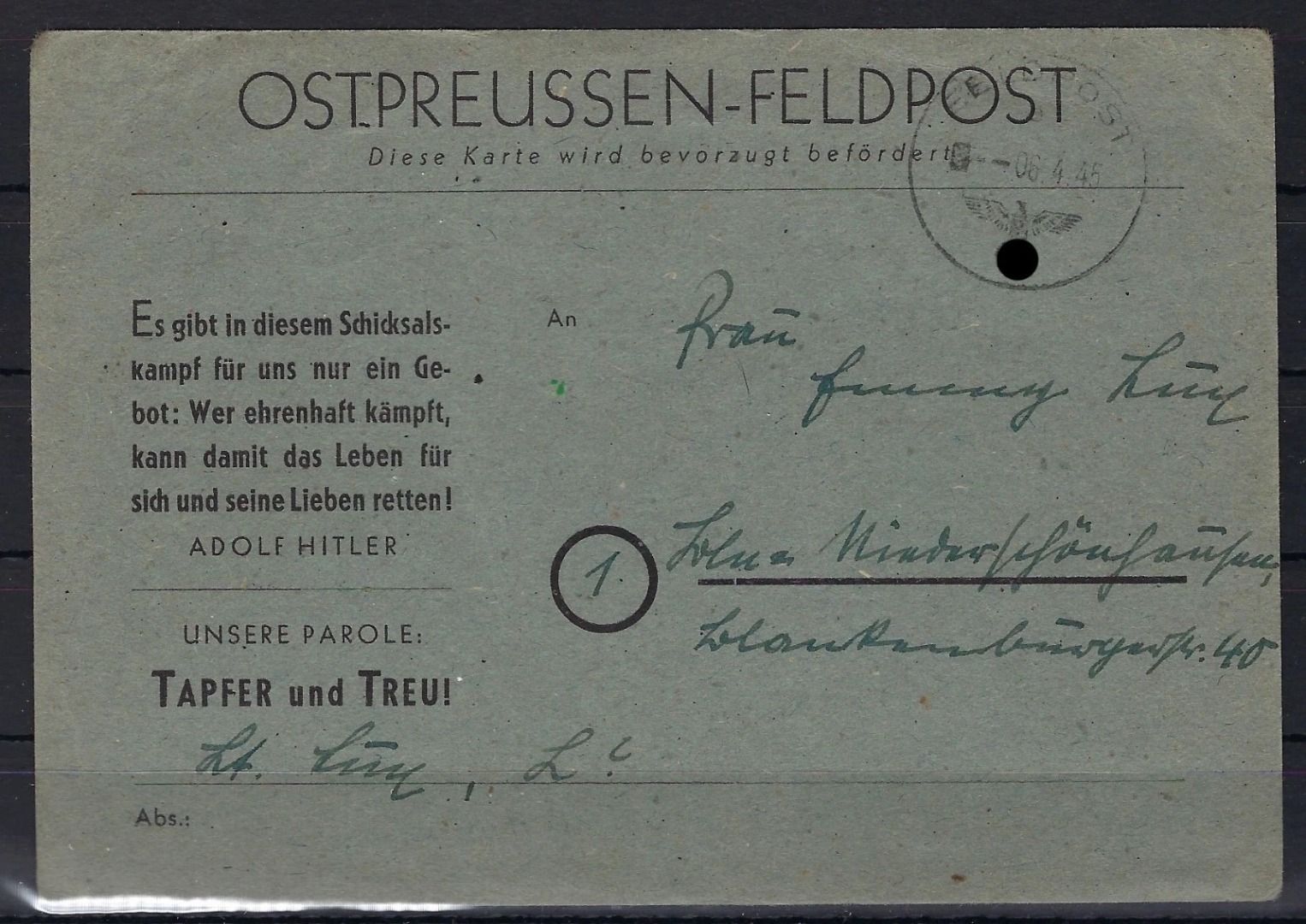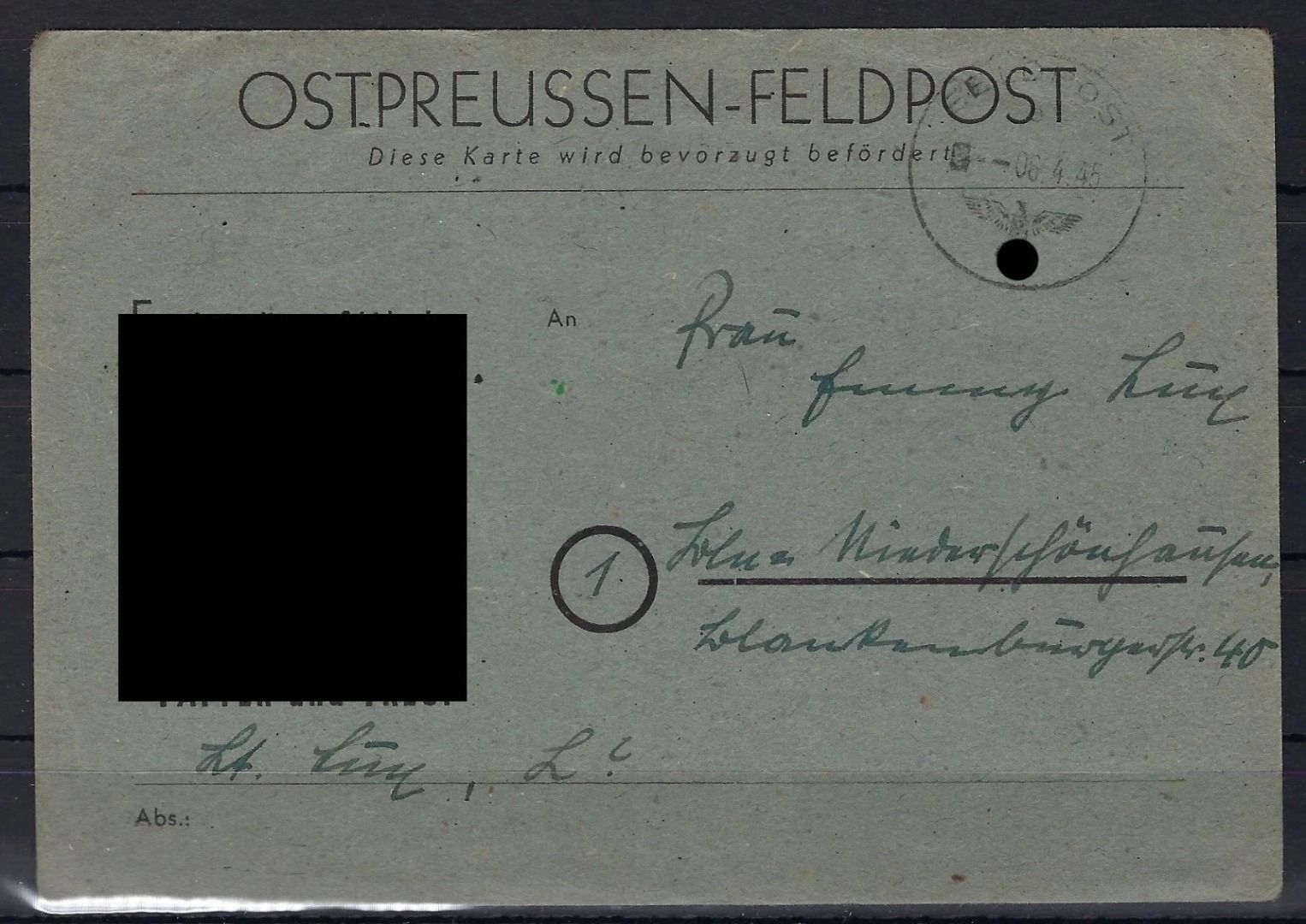 Ostpreußen Feldpost eines Leutnants, P 2 e (graublau), 6.4.45, ME 1200€