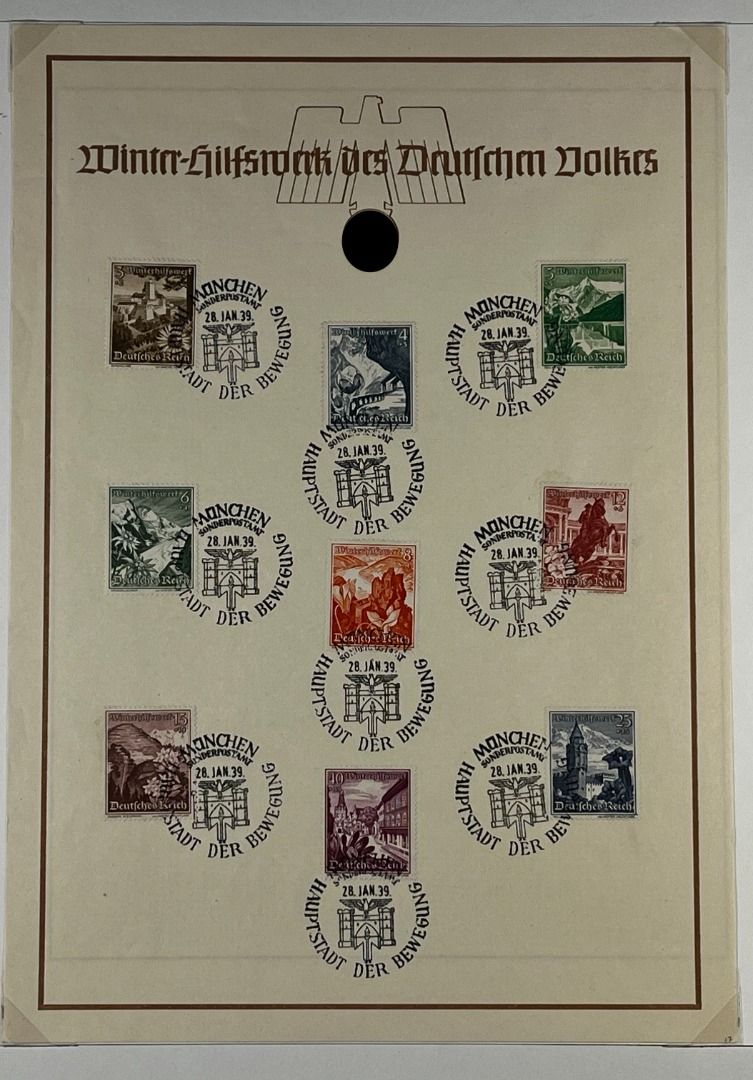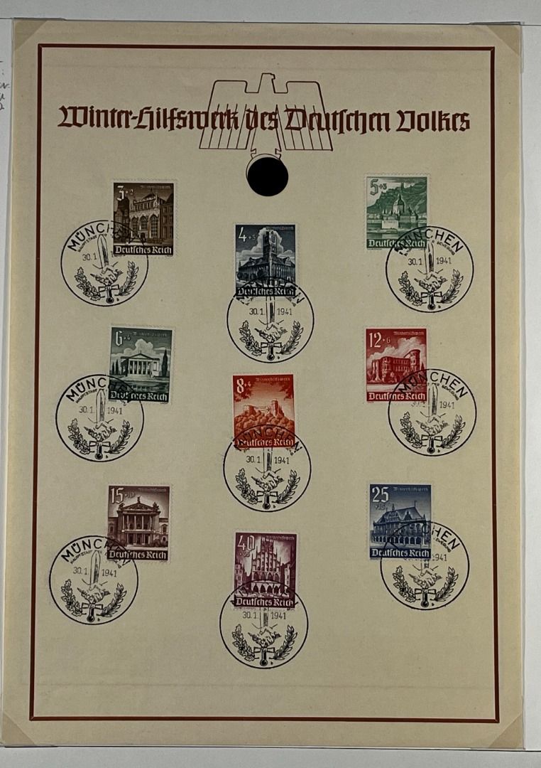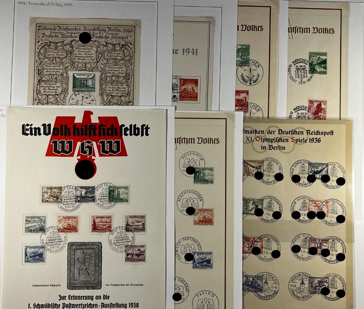 3. Reich, 7 Gedenkausgaben / Gedenkblätter 1936–1941, davon Olympiade 1936 ungefaltet (in ungefalteter Erhaltung nicht häufig zu finden), WHW 1937 (2), WHW 1938, WHW 1940 (2), Nationale Briefmarkenausstellung 1940. Schönes Lot!