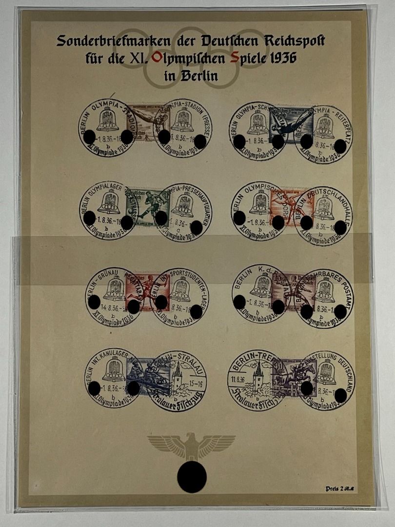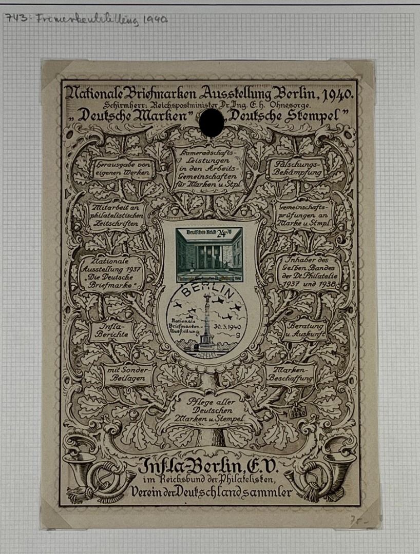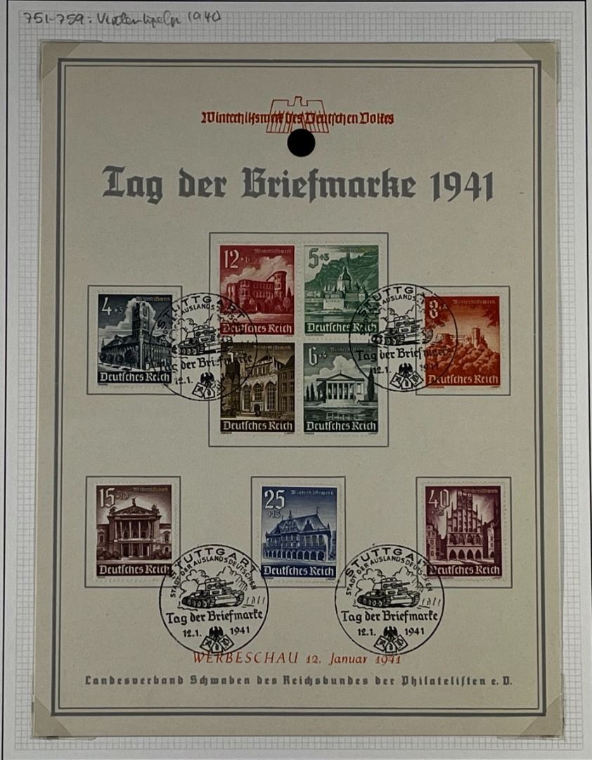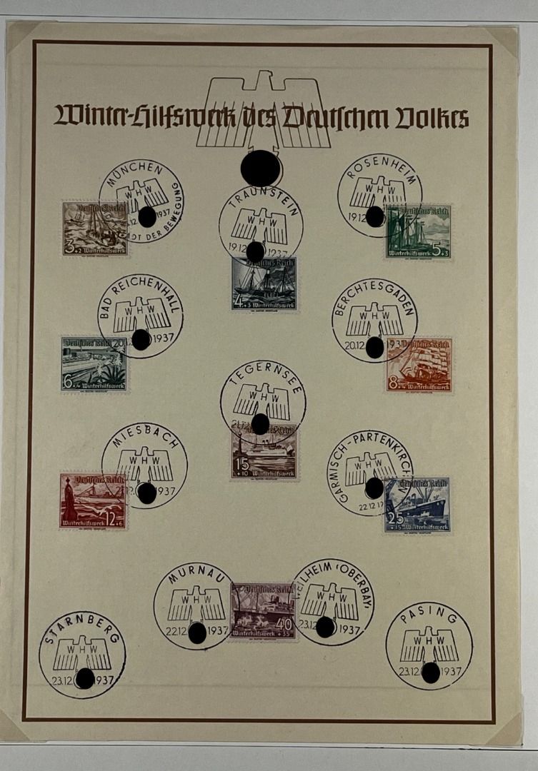 3. Reich, 7 Gedenkausgaben / Gedenkblätter 1936–1941, davon Olympiade 1936 ungefaltet (in ungefalteter Erhaltung nicht häufig zu finden), WHW 1937 (2), WHW 1938, WHW 1940 (2), Nationale Briefmarkenausstellung 1940. Schönes Lot!