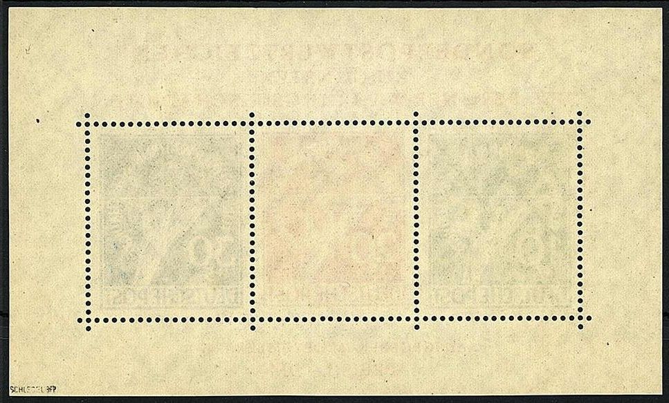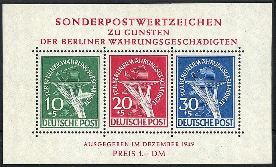 Währungsgeschädigten-Block 1949, postfrischer Erhaltung und in einwandfreier Qualität, die 10 Pf. Marke mir der sog. ,,Putze". Eine solche ,,Putze", einmal auf die Druckplatte geraten, verhindert an der Auflagestelle den beabsichtigten Farbdruck und kann so die phantasievollsten Zusätze im Markenbild hervorheben. In dieser Konstellation ein sehr interessantes Exemplar, tiefst geprüft Schlegel BPP