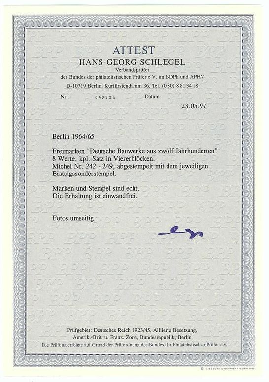 P) Berlin Mi 242-249 ° im VB mit Gummi in Luxus Qualität, mit FFA Schlegel BPP, ME 560€