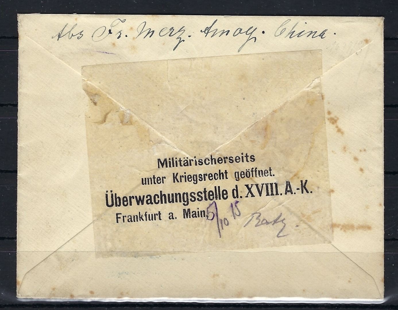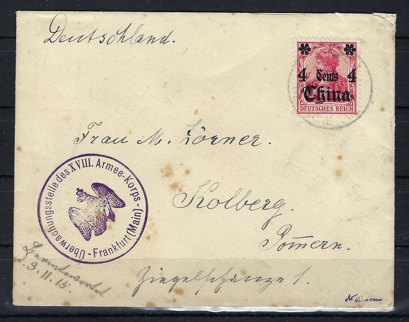 DAP China 1905, Zensurbrief befördert von Amoni nach Kolberg in Pommern), vorderseitig Zensurstempel der Überwachungsstelle des XVIII Armee-Korps Frankfurt am Main, rückseitig entsprechende Zensur Zettel "Militärischerseits unter Kriegsrecht geöffnet....... " seltener Ausgangsort, signiert.