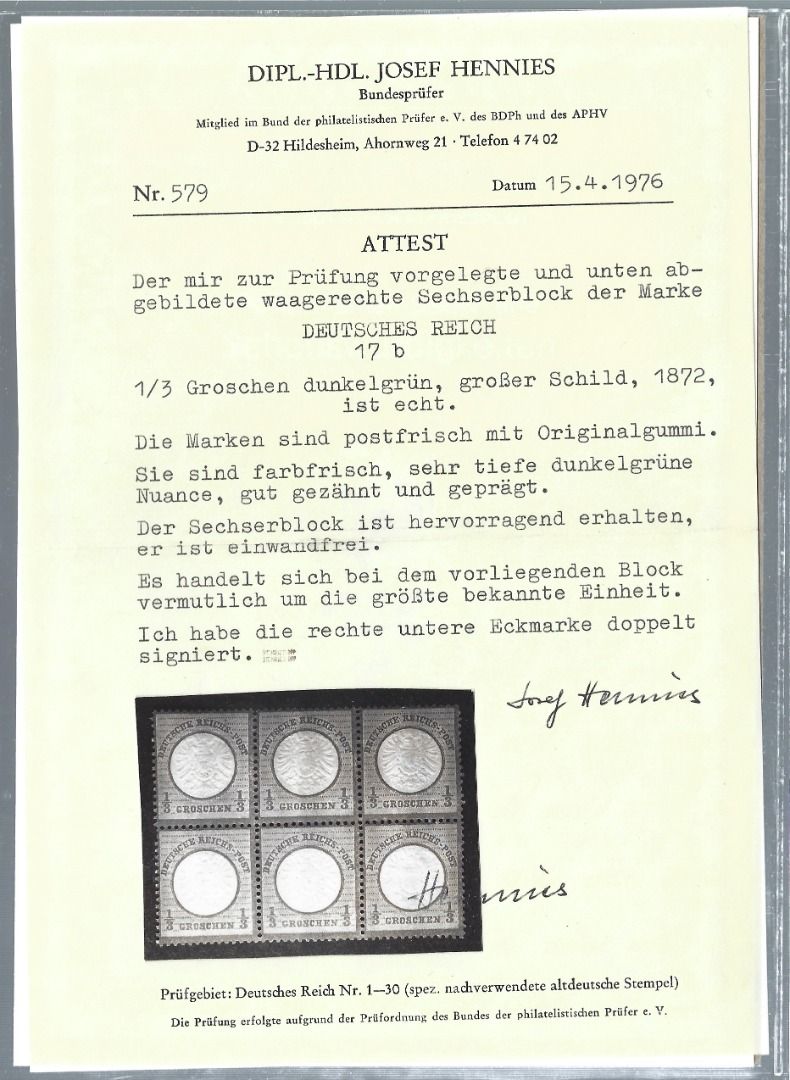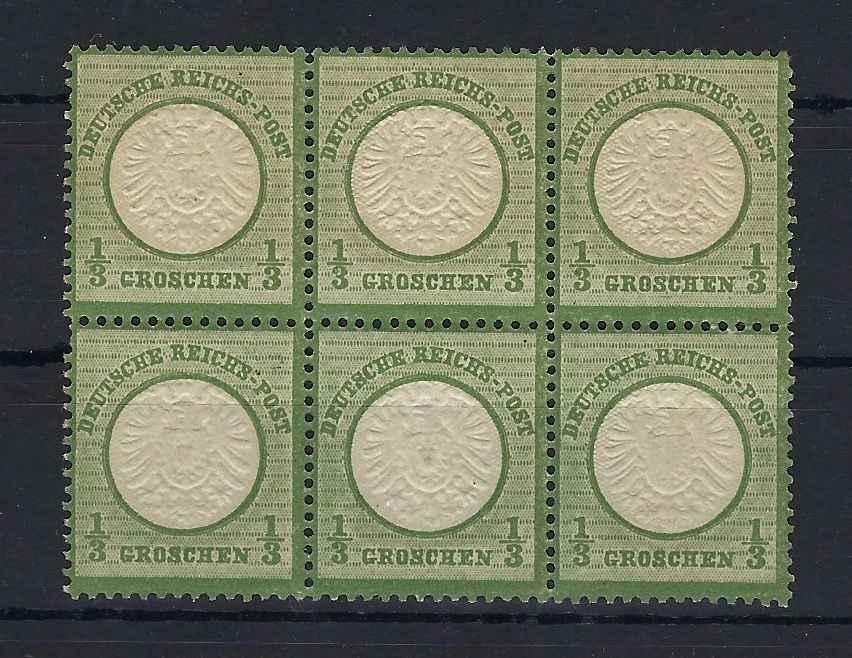DR Brustschilde Mi 17 b in einem seltenen Bogenteil zu 6 Marken in postfrischer Erhaltung, die obere 3 Marken sind rückseitig etwas gebräunt, rechts in der waagerechten Zähnung minimal angetrennt, die untere Reihe befindet sich in einwandfreier Qualität. Laut Attest handelt es sich (zum Zeitpunkt der Prüfung) um die größte bekannte Einheit.