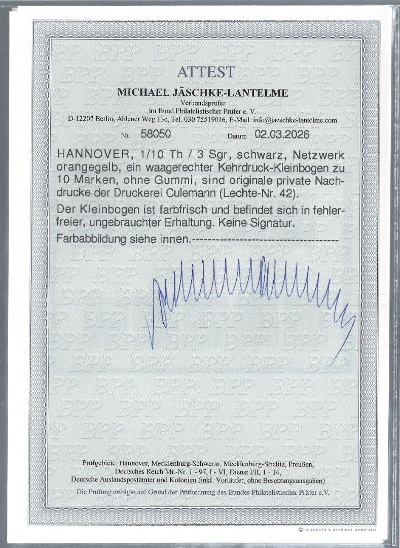 Hannover, Lechte-Nr. 42 (*) ungebraucht ohne Gummi, Kerndruck-Kleinbogen, Privatdruck der Königlichen Hannoverschen Buchdruckerei Culemann. Mit FFA Jäschke-Lantelme BPP. Seltene Gelegenheit, ein Stück hannoverscher Geschichte zu erwerben