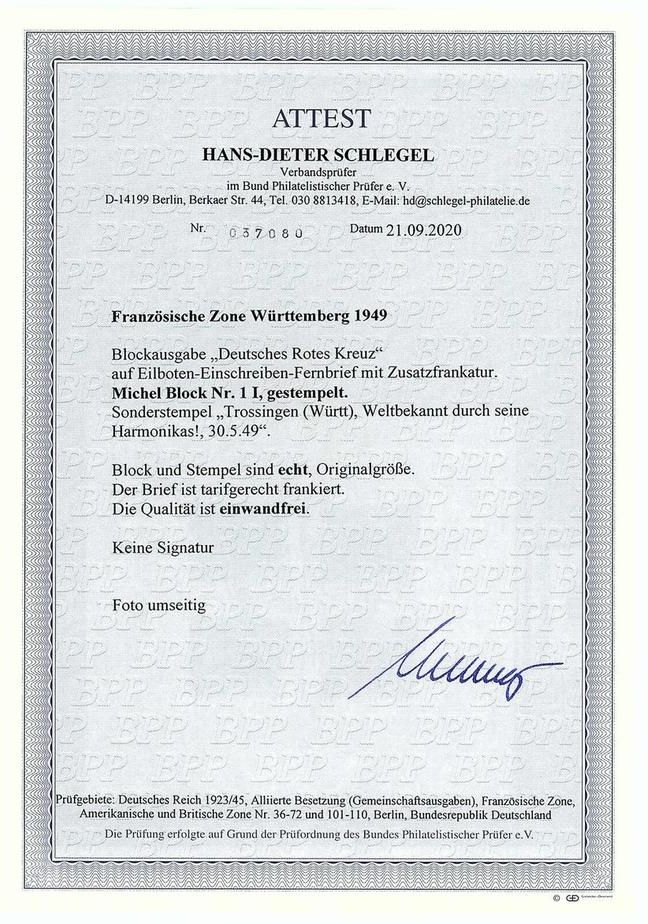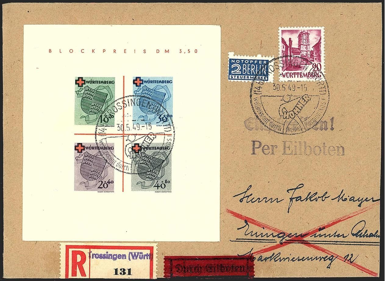 C) Württemberg Block 1 I auf Einschreibebrief durch Eilboten, befördert von Trossingen nach Eningen (unter Aachen), rückseitig mit Ankunftstempel. portogerecht, einwandfreie Qualität mit FFA Schlegel BPP, ME 2.500€