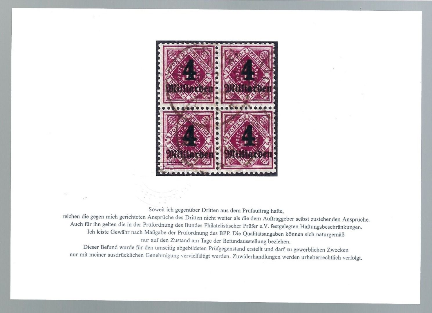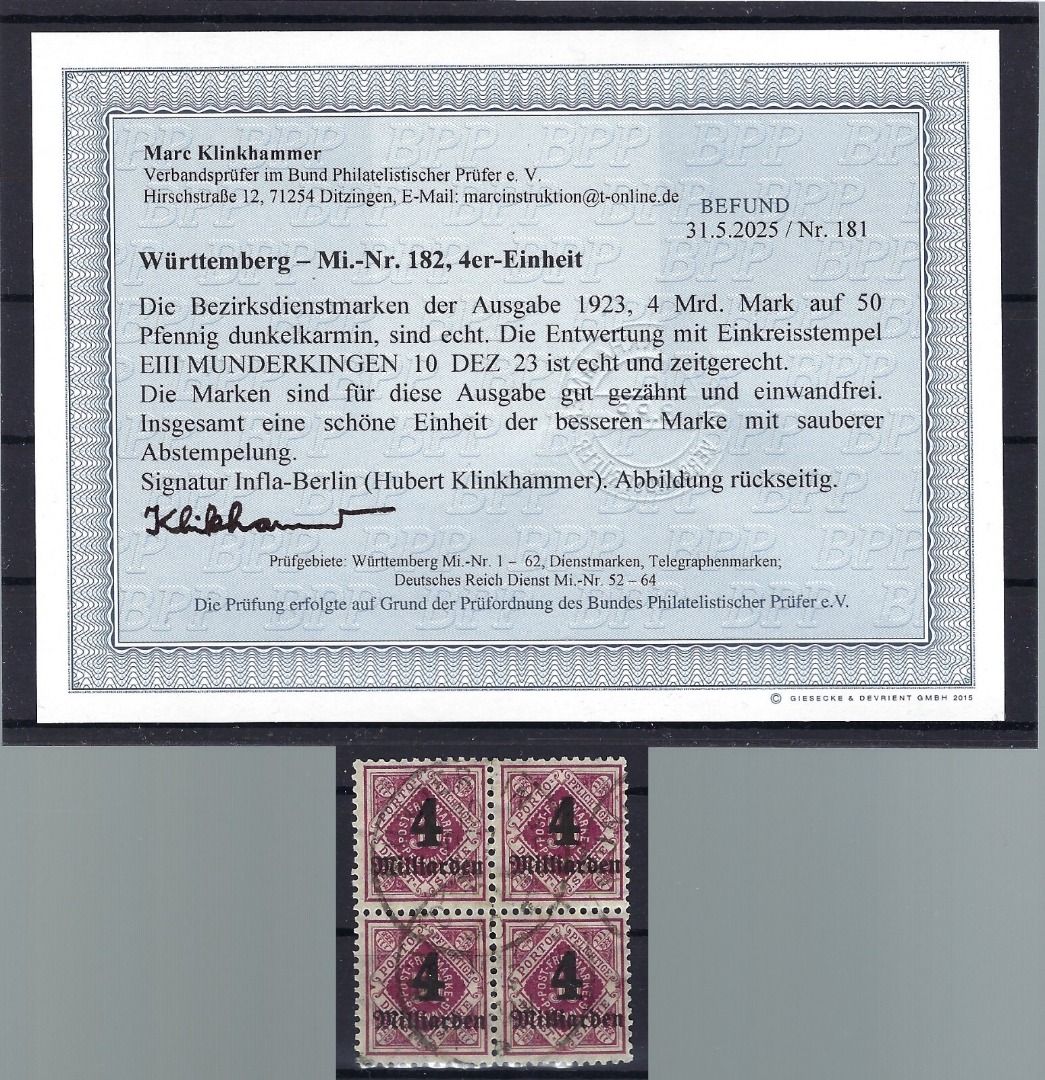 Württemberg Mi D 182° Viererblock mit Tagestempel einwandfrei, Befund Klinkhammer BPP