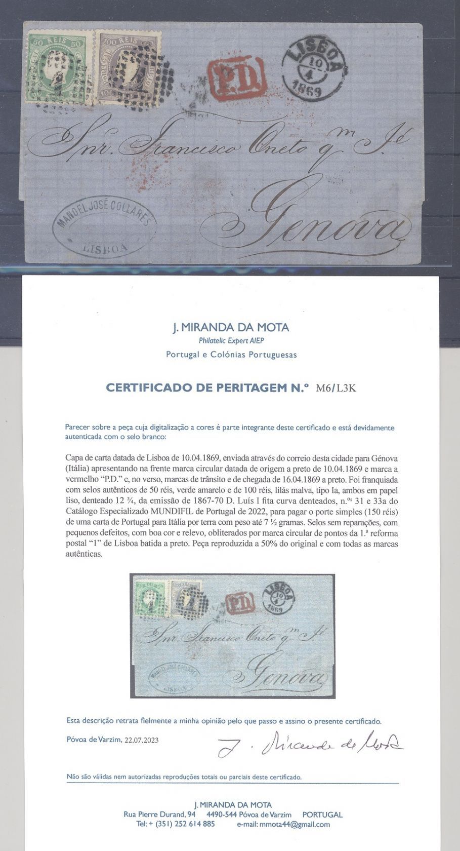 Portugal, sehr interessanter und zudem dekorativer Brief frankiert mit 50 R + 100 R König Luis 1867 aus Lissabon mit rotem "P.D." Stempel nach Italien gelaufen. Es liegt ein Befund Da Mota vor, ist mit eingescannt.